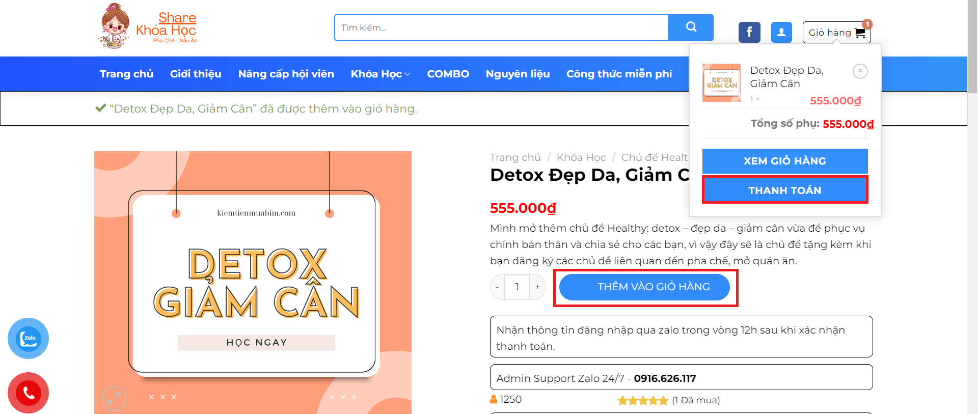 Bước 2: Bạn vào website và lựa chọn khóa học phù hợp, rồi nhân thêm vào giở hàng. Khi bạn đã thêm vào giỏ hàng tiếp tục ấn mục thanh toán.( Như ảnh sau đây)